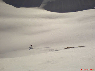 Da bei den Felsen noch sehr wenig Schnee lag, lies sich eine, trotz erheblicher Lawinengefahr, sichere Spur finden. Endlich am Gletscher angekommen meldeten sich die Oberschenkel nach der doch recht anstrengenden Spurarbeit und so gings in gemütlichen Tempo zur Gipfelflanke. Die Gipfelflanke konnte durchgehend mit Ski begangen werden, war aber teilweise sehr hart (Harscheisen wären angebracht). Manu blieb im Skidepot zurück, da ihr die Gipfelflanke keine Abfahrtsfreuden versprach. Bei starken Sturm gings dann in leichter Kraxelei noch 10m hinüber auf den eigentlichen Gipfel. Dort angekommen konnte die super Aussicht nur kurz genossen werden, der Sturm zwang zum schnellen Abstieg. Bis zum Gletscher gabs recht griffigen hartgefrorenen Schnee. Am Gletscher trübte ein nicht tragfähiger Windharschdeckel kurz unsere Abfahrtsfreuden. Doch ab dem Felsriegel unter dem Gletscher gaben wir uns vollkommen dem Pulverrausch hin.