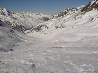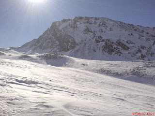 Da heute Nachtskilauf ist, erspare ich mir die ersten Höhenmeter und fahre mit dem Hochalterlift hinauf. Da ein ziemlicher Sturm bläst wird es auf dem Lift ziemlich kalt und so bin ich froh endlich oben angekommen zu sein. Ich quere über die „Kamelbuggl“ zum Skiweg des Schwarzmoosliftes. Hier felle ich auf und gehe erstmal gemütlich über den Skiweg zur Bergstation des Schwarzmoosliftes. Da der Mond sehr hell scheint brauche ich keine Stirnlampe. Da ich bei den Schwarzmoosseen bemerke, dass der Wind zu umfangreichen Triebschneeansamlungen geführt hat, entscheide ich, mein eigentliches Ziel, den Pirchkogel abzublasen und stattdessen die Scharte zwischen dem Vorderem und Hinterem Kühtaier Grießkogel in Angriff zu nehmen. Da ich für die Spuranlage etwas Licht brauche schalte ich meine kleine LED Funzel an. Mühsam spure ich durch bis zu 1m tiefen Triebschnee über kurze Steilstufen auf die Scharte hinauf. Oben trifft mich der Sturm wieder mit voller Wucht und so wird nichts aus einer gemütlichen Gipfelrast. Jetzt packe ich meinen „Scheinwerfer“ aus und tauche das ganze Tälchen einmal in Licht. Wow das Ding ist wirklich hell. Das Licht ist für die Abfahrt absolut ausreichend und ich kann sogar richtig schöne, schnelle, lang gezogene Schwünge in den unverspurten Schnee zaubern.